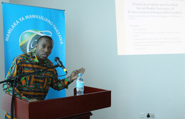 Mhadhili wa Maswala ya Habari kutoka Chuo Kikuu cha Dar es Salaam,Ndg. Doto Kuhenga akiwasilisha Mada yake ya kuhusu Mwenendo na Utaalam unaopaswa kufuatwa na Waendeshaji wa Mitandao ya Kijamii pindi wafikishapo habari kwa jamii,wakati wa Warsha ya Siku mbili kwa Waendeshaji wa Mitandao ya Kijamii (Bloggers) hapa nchini iliyomalizika leo kwenye Ukumbi wa Mikutano wa Mamlaka ya Mawasiliano Tanzania (TCRA),Sinza B jijini Dar es Salaam.
